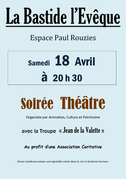 Venez passez une agréable soirée dans le rire et la bonne humeur avec la troupe « Jean de la Valette ». Au profit d’une association caritative.